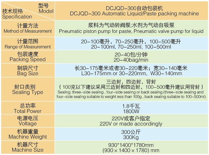 DCJQD-300气动液体/酱料自动包装机技术参数: