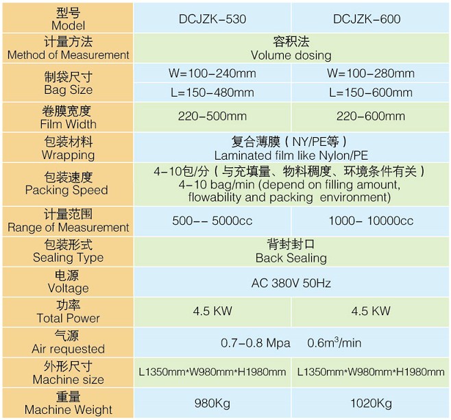DCJZK-530/600全自动充填式液体(膏体)包装系统技术参数: