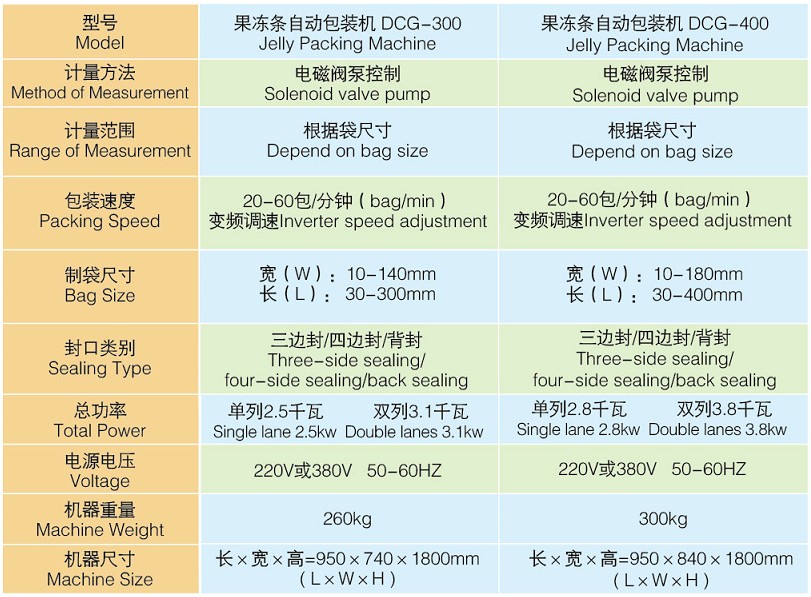 DCG-300/400果冻条自动包装机技术参数: